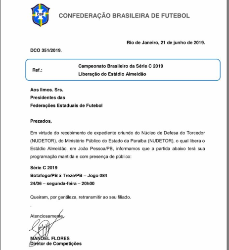 A Confederação Brasileira de Futebol liberou a presença de público para o jogo entre Botafogo e Treze, marcado para segunda-feira, às 20h, no estádio Almeidão, pela nona rodada do Campeonato Brasileiro da Série C. Segundo documento, assinado por Manoel Flores, diretor da CBF, a liberação tem como base os laudos técnicos encaminhados pelo Ministério Público.