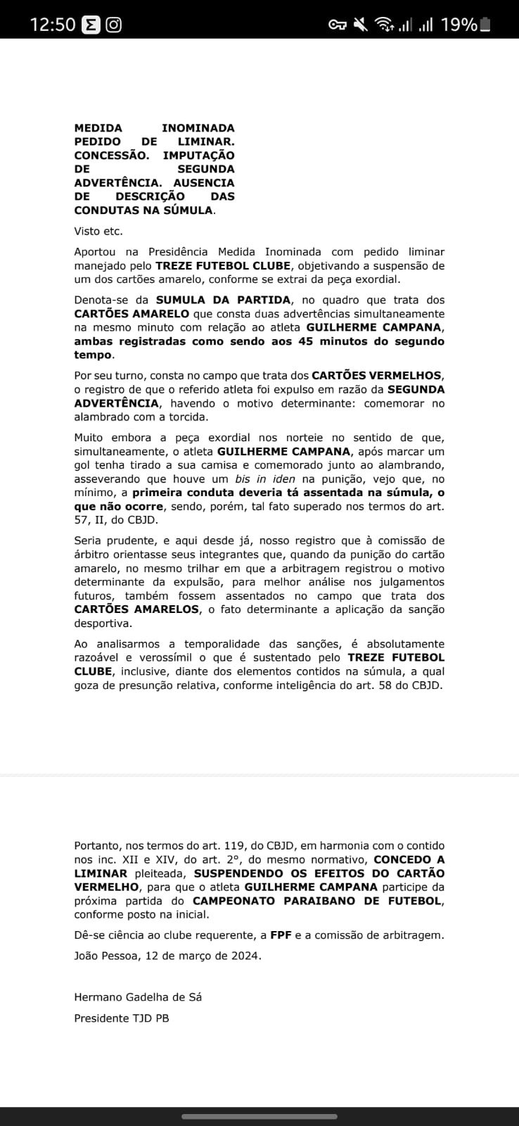 O meia Gui Campana que foi expulso no jogo passado vai poder jogar por força de liminar do Tribunal de Justiça Desportiva da Paraiba.
