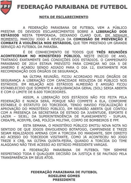 FutebolFederação divulga nota sobre liberações dos estádios de futebol Compartilhar Tweetar Compartilhar Compartilhar Email ComentáriosA diretoria da Federação Paraibana de Futebol divulgou nota nesta sexta-feira afirmando que sempre tem seguido as determinações e decisões da Justiça, tendo marcado os jogos do Campeonato Paraibano com base em recomendações dos órgãos de segurança. Notícias Relacionadas: Compartilhar Tweetar Compartilhar Compartilhar Email Clique para comentarDeixe um Comentário Cancelar respostaO seu endereço de e-mail não será publicado. Campos obrigatórios são marcados com *Comentário *Nome * E-mail * Site Salvar meus dados neste navegador para a próxima vez que eu comentar. ΔEsse site utiliza o Akismet para reduzir spam. Aprenda como seus dados de comentários são processados.