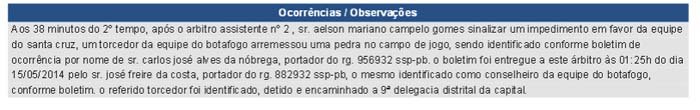 O árbitro Ranilton Oliveira de Sousa, maranhense, colocou na súmula que um torcedor arremessou uma pedra contrata o assistente 2 Aelson Mariano Campelo Gomes durante o jogo Botafogo 1×1 Santa Cruz-PE, nesta quarta-feira, no estádio Almeidão, pela Copa do Brasil.
