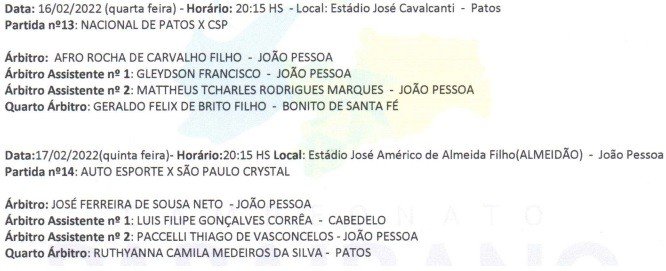 Afro Rocha comanda o jogo entre Nacional de Patos e CSP, nesta quarta-feira (16). Enquanto que, José Ferreira Neto apita Auto Esporte e SPC, na quinta-feira (17). Os dois têm validade pela quarta rodada do Certame Estadual da Paraíba.