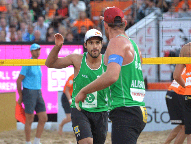 Alison e Bruno Schmidt são os novos campeões da Copa do Mundo. Diante de arena lotada de Haia, a ‘Dupla Capixaba’ venceu Numerdoor / Varenhorst por 2 a 1 (parciais de 12-21, 21-14 e 22-20, em 59 minutos), há pouco, neste domingo, dia 5, depois de salvar cinco match points, e conquistou, de forma invicta, o título da competição mais importante da temporada. Com o título, o Brasil garantiu a segunda vaga nas Olimpíadas Rio 2016 e o sexto título do país na história do campeonato. Campanha impecável (oito vitórias, 16 sets vencidos e apenas dois perdidos), bicampeonato do ‘Mamute’ (2015/2011), feito inédito do ‘Mágico’ e o ‘laranja’ de Haia deu lugar ao verde e amarelo sob aplausos das arquibancadas. Emoção dos campeões.