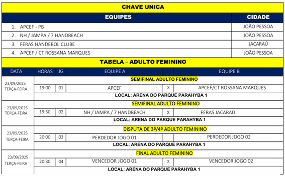 Para esta terça-feira (23) estão programadas as partidas decisivas do handebol de praia feminino, com jogos programados para a quadra que fica no Parque Parahyba I, no Bairro do Bessa, em João Pessoa-PB. Veja a programação: