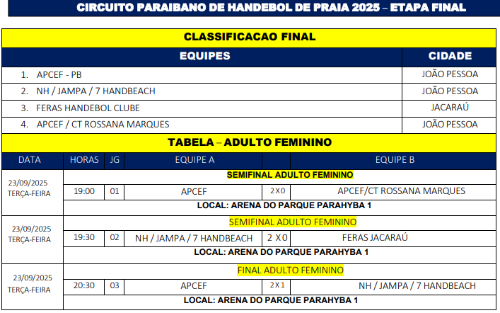 Encerrado o Campeonato Paraibano de handebol de areia feminino, o time da Apcef conquistou o título ao vence NH/Jampa 7 HandBeach por 2 a 1. A decisão aconteceu nesta terça-feira (23), na Arena do Parahyba I, no bairro do Bessa, em João Pessoa-PB.