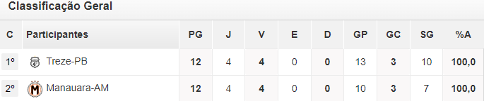 Apenas quatro equipes continuam com 100% de aproveitamento entre as quatro divisões do Campeonato Brasileiro. O time do Treze está na lista premiados, ao lado do Manauara-AM, na Série D. Ainda faz parte da seleção, o Athletic-MG e Ypiranga-RS, na Série C.