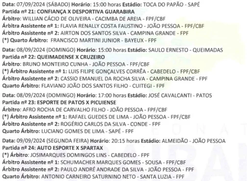 A Federação Paraibana de Futebol, através da comissão de arbitragem definiu os árbitros e assistentes da quinta rodada do Campeonato Paraibano da Segunda Divisão de 2024. A rodada começa neste sábado (7), tem jogos no domingo (8) e termina na segunda-feira (9).