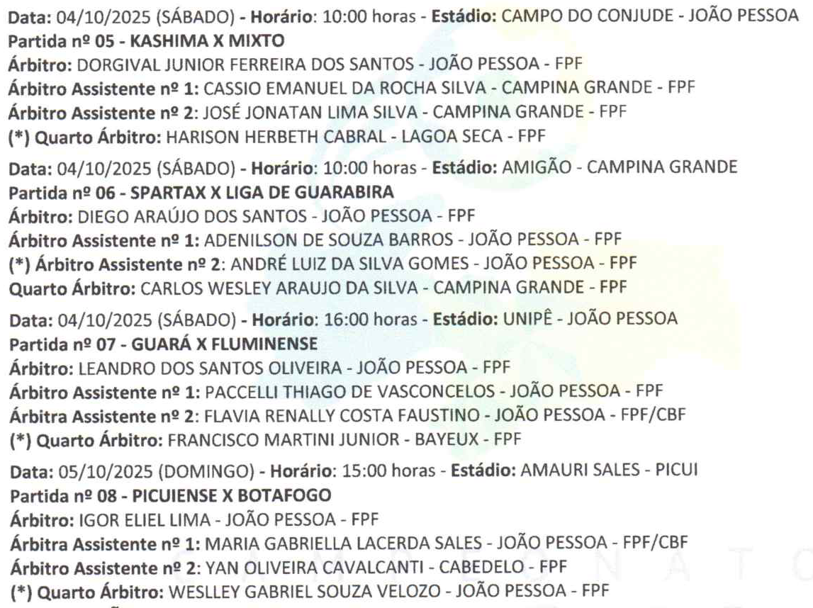 Definida a arbitragem para a segunda rodada do Campeonato Paraibano de Futebol Feminino Sub-17, com três partidas programadas para o sábado (4) e um jogo marcado para o domingo (5).