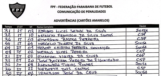 Fonseca saiu distribuindo cartões para os atletas dos dois times como se doa bons para crianças em dias de festa. Foram seis cartões amarelos para o CSP e cinco para os atletas do Sousa. Veja a súmula: