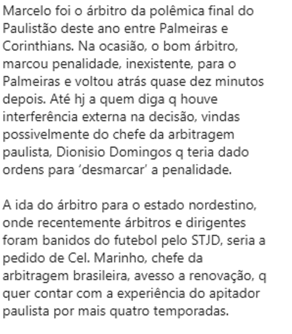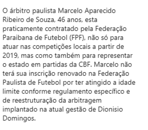 Estas informações estão publicadas no instagran do próprio árbitro Marcelo Aparacido de Souza – marcelomarcal.oficial Tentamos um contato com a presidente da Federação Paraibana de Futebol, Michele Ramalho, mas ela não deu retorno ao www.soesporte.com.br
