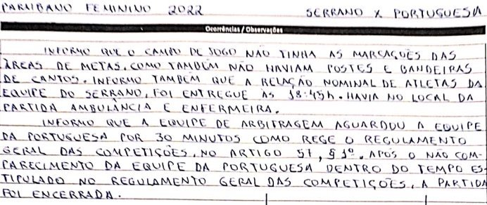 A Federação Paraibana de Futebol publicou nesta quinta-feira a súmula do jogo que não foi realizado entre Serrano e Portuguesa. O encontro estava programado para ser disputado nesta quarta-feira (19), na Vila Olímpica Plínio Lemos, em Campina Grande, pelo Campeonato Paraibano de futebol feminino.