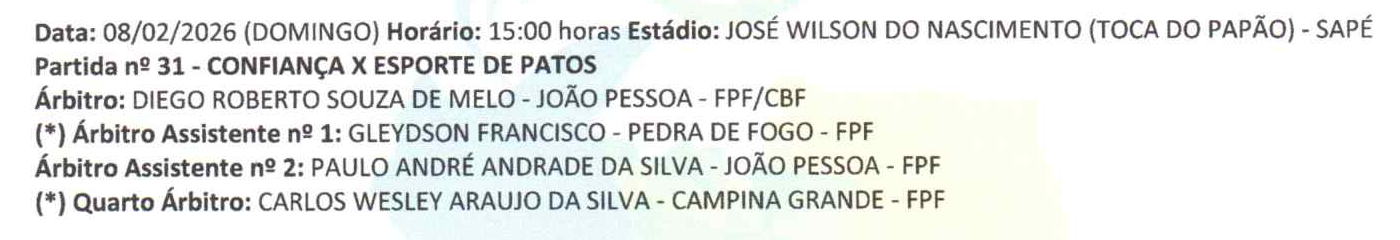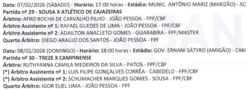 Definida a arbitragem para os jogos de sábado (7), domingo (8) e segunda-feira (9), na sequência da primeira fase do Campeonato Paraibano da Primeira Divisão de 2026. Além das partidas pela sexta rodada que envolvem Sousa x Atlético de Cajazeiras; Treze x Campinense; a Federação Paraibana de Futebol também programa outros dois jogos: Confiança de Sapé x Esporte de Patos, pela sétima rodada e Serra Branca x Nacional de Patos, pela oitava rodada.