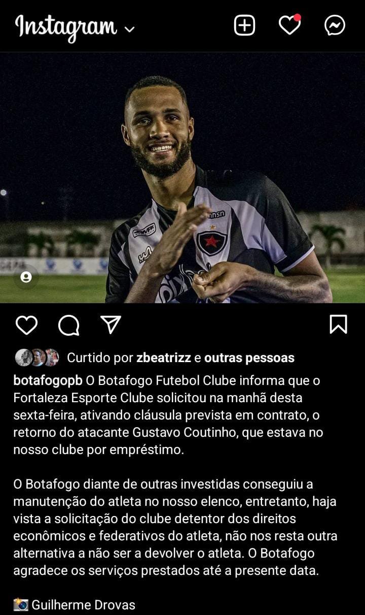 “O Botafogo Futebol Clube informa que o Fortaleza Esporte Clube solicitou na manhã desta sexta-feira, ativando cláusula prevista em contrato, o retorno do atacante Gustavo Coutinho, que estava no nosso clube por empréstimo”.
