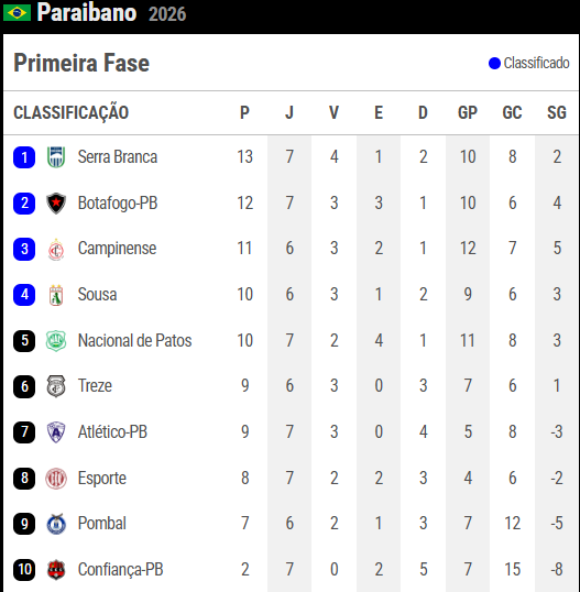 Atlético de Cajazeiras 0x2 Botafogo-PB, no estádio Perpetão, às 19h30, em Cajazeiras, pela sétima rodada do Campeonato Paraibano da Primeira Divisão de 2026, fim de jogo. O time botafoguense assumiu o segundo lugar, com 12 pontos, na classificação geral.