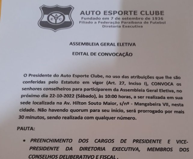 O Auto Esporte entra no processo de eleição e convoca os conselheiros, de acordo com edital assinado pelo atual presidente Adriano Gomes. O Conselho Deliberativo se reúnem, seguindo a assembleia Geral Eletiva, no próximo dia 22, às 10h, na sede do clube, no Colosso Alvirrubro, em Mangabeira.
