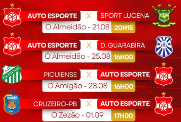 A tabela de jogos do Auto Esporte na Segunda Divisão do Campeonato Paraibano tem quatro rodadas definidas. A contagem regressiva começou. A próxima partida no dia 21/08 e a primeira batalha, contra a equipe do Sport Lucena. O jogo será às 20h15 no Almeidão.