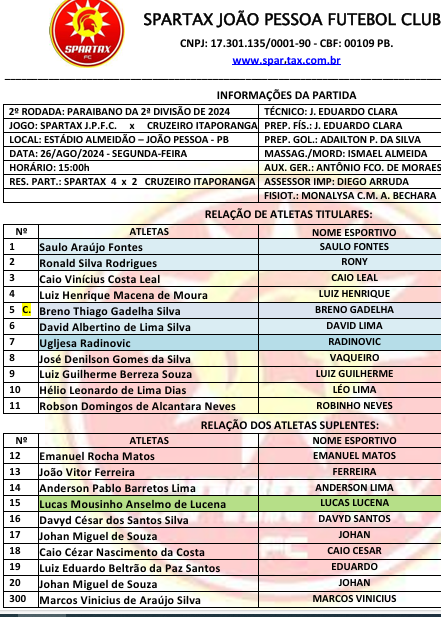 Auto Esporte 2×0 Spartax, pela primeira fase do Campeonato Paraibano da Segunda Divisão de 2024, nesta segunda-feira (9), às 20h15, no estádio Almeidão, em João Pessoa.