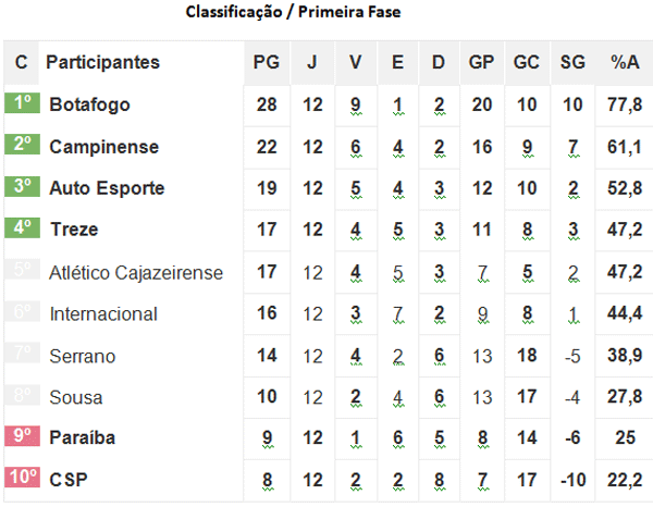 | 2º | Campinense | 22 | 12 | 6 | 4 | 2 | 16 | 9 | 7 | 61,1 |