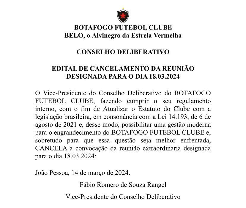 O vice-presidente do Conselho Deliberativo do Botafogo-PB Fábio Rangel cancela reunião que estava programada para o próximo dia 18. Segundo informações, a reunião seria para transformar o clube em Sociedade Anônima (SAF). Veja o edital