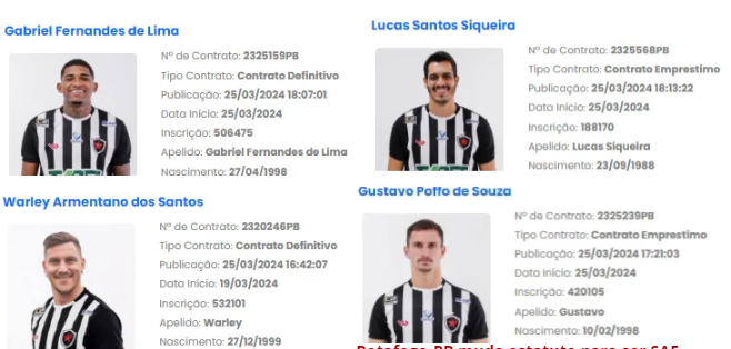 Novos jogadores contratados nesta segunda-feira (25) já estão regularizados juntos ao boletim informativo diário (BID) da Confederação Brasileira de Futebol (CBF). Com isso, os atletas ganham condição para jogar contra o Bahia-BA, nesta quarta-feira (27), no estádio Almeidão, em João Pessoa. Eles estão liberados para atuar pelo Campeonato Paraibano de 2024.