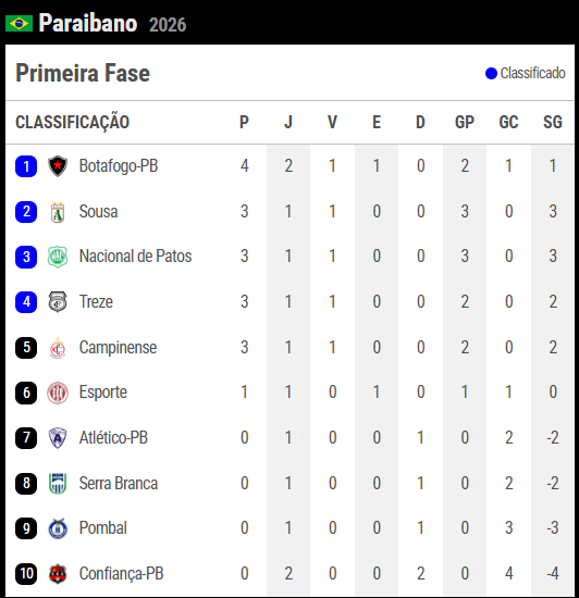 Com um gol ainda no primeiro tempo, através de Varela, o Botafogo-PB venceu o Confiança de Sapé por 1 a 0, nesta quarta-feira (21), no estádio Toca do Papão, e assumiu a liderança do Campeonato Paraibano de 2026, com quatro pontos ganhos, dois jogos, uma vitória e um empate.