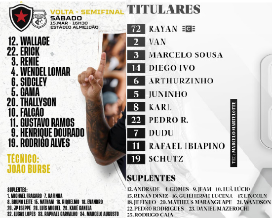 Desfalques do Botafogo-PB: Guilherme Santos (suspenso), Igor Ribeiro (transição), Diego Ferreira (transição), Ronaldo (transição), Lucas Balardin (DM), Igor Maduro (DM) e Edílson (DM).