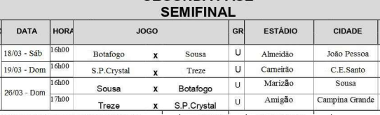 A Federação Paraibana de Futebol divulgou a tabela da fase semifinal do Campeonato Paraibano. Jogos de ida: Botafogo e Sousa jogam no sábado (18), no Almeidão, às 16h. São Paulo enfrenta o Treze, domingo (19), às 16h, no Carneirão.
