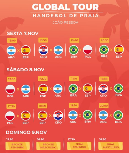 A partir desta sexta-feira (7), a etapa final do Circuito Mundial de Handebol de Praia. Com o Brasil como anfitrião, a competição recebe mais quatro países: Argentina, Espanha, Croácia e Polônia. Os jogos têm entrada gratuita para o público na arena do Paraíba World Beach Games, no Busto de Tamandaré, entre as praias de Tambaú e Cabo Branco. As finais estão marcadas para o domingo (9).