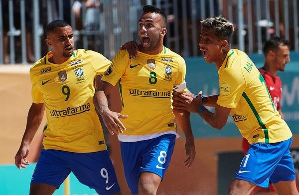 Doze vezes campeão. O Brasil venceu Portugal por 6 a 4 (Datinha (2), Rodrigo (2), Mauricinho e Bruno Xavier, Léo Martins (2), Madjer e Coimbra, para os portugueses), há pouco, neste domingo, dia 23, e conquistou pela 12ª vez o título do Mundialito (17/16/10/07/06/05/04/02/00/99/97/94), na praia de Carcavelos, em Cascais, competição que reuniu os quatro campeões da ‘Era FIFA’ pela primeira vez. (Foto – Lea Well / BSWW)Esta foi a 38ª vitória consecutiva e a de número 38 sobre os lusitanos em 46 confrontos disputados até hoje. A Seleção Brasileira, pentacampeã da Copa do Mundo (2017-2009-2008-2007-2006), comemorou o oitavo título em oito competições sob o comando de Gilberto Costa, o de número 101 de sua história.