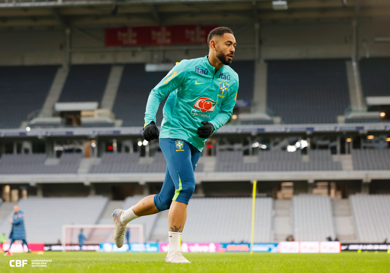 Matheus Cunha corre durante treino pela Seleção na Decathlon Arena, em LilleCréditos: Rafael Ribeiro / CBF