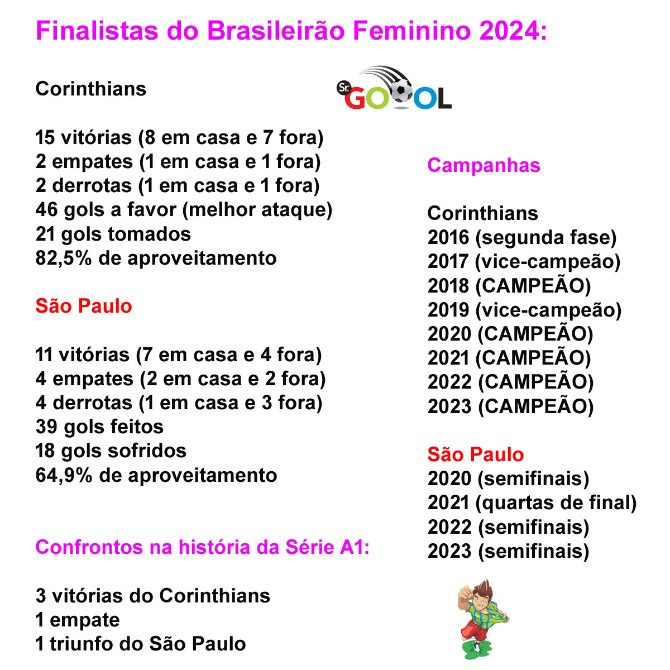 O Brasileirão Feminino será decidido por Corinthians e São Paulo nos dois próximos fins de semana. Em 12 edições, a categoria terá sua 8ª final paulista, segundo levantamento do Sr. Goool. Se as Brabas decidirão o título pela 8ª vez seguida, as Soberanas estão na final de forma inédita.