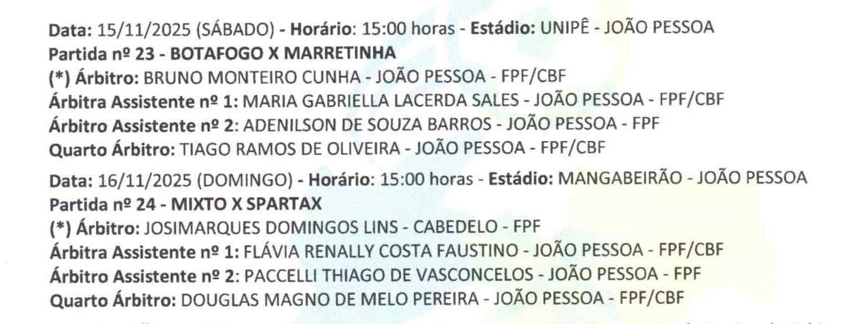 O árbitro Bruno Monteiro apita a partida entre Botafogo-PB e Marretinha, neste sábado (15), às 15h, no campo do Unipê. Enquanto que, Josimarques Domingos vai comandar o jogo envolvendo Mixto e Spartax, no domingo (16), no estádio Evandro Lelis, campo do Auto Esporte, em Mangabeira.