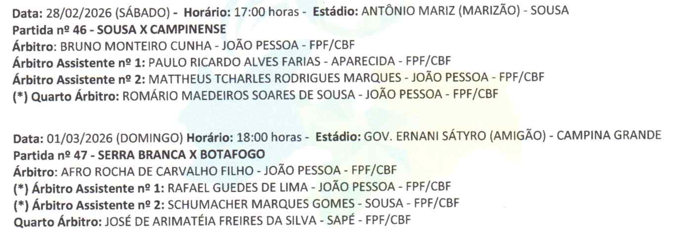 A arbitragem está confirmada para as partidas de ida da fase semifinal do Campeonato Paraibano da Primeira Divisão de 2026. O árbitro Bruno Monteiro apita o encontro entre Sousa e Campinense. Enquanto Afro Rocha comanda a partida envolvendo Serra Branca x Botafogo-PB.