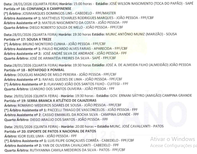 O árbitro Bruno Monteiro comanda a partida entre Sousa e Treze, programada para esta quarta-feira (28), pela quarta rodada da primeira fase do Campeonato Paraibano da Primeira Divisão de 2026. Josimarques Domingos apita o encontro Confiança de Sapé e Campinense.