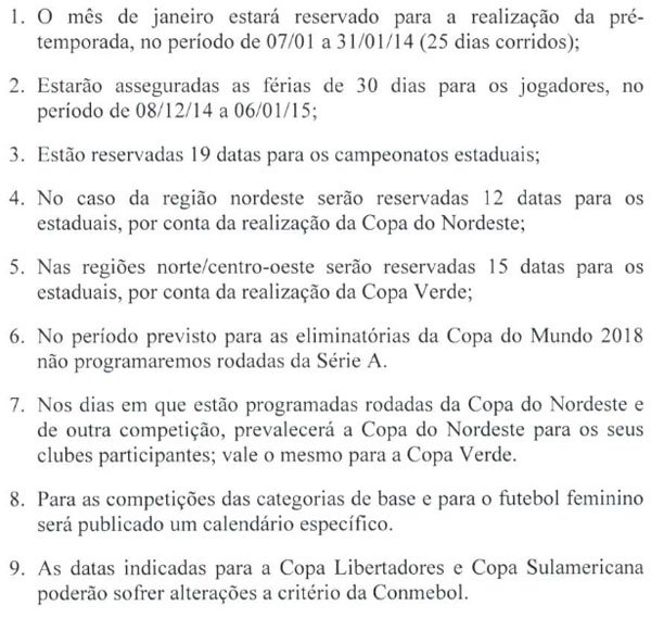 A Diretoria de Competições da CBF divulgou nesta quarta-feira, com cinco meses de antecedência se for tomado como referência o início da temporada, o calendário do futebol brasileiro de 2015. A principal novidade está no período reservado para a realização da pré-temporada dos clubes: de 7 a 31 de janeiro (25 dias).