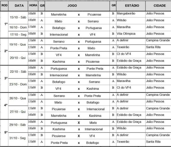 Com quatro partidas, o Campeonato Paraibano de Futebol Feminino começa no fim de semana, no sábado (15), domingo (16) e segunda-feira (17) de acordo com a tabela divulgada pela Federação Paraibana de Futebol. No sábado (15), o Marretinha joga contra Picuiense e o Mixto joga contra o Serrano. Para o domingo estão programados mais um jogo, Botafogo x Portuguesa. Na segunda tem Internacional x VF4.