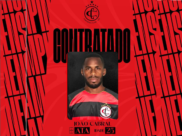 O Campinense confirmou nesta quinta-feira (24) a contratação do atacante João Cabral, de 25 anos. Ele tem 1,88m de altura. O mais novo nome a integrar o elenco rubro-negro. Natural do Maranhão, ele traz experiência nas categorias de base de grandes clubes como as do Internacional de Porto Alegre e Criciúma-SC.