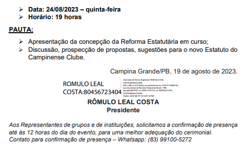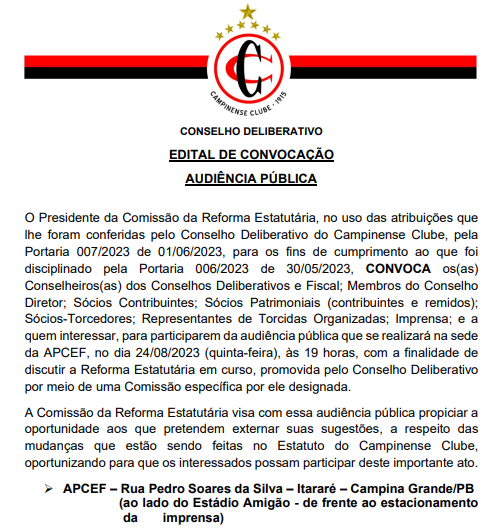 A reforma estatutária do Campinense já tem data e local para acontecer. De acordo com edital de convocação assinado pelo presidente da Comissão, Rômulo Leal Costa. Veja o documento publicado neste sábado (19), que convoca sócios, torcedores e dirigentes de torcidas organizadas.