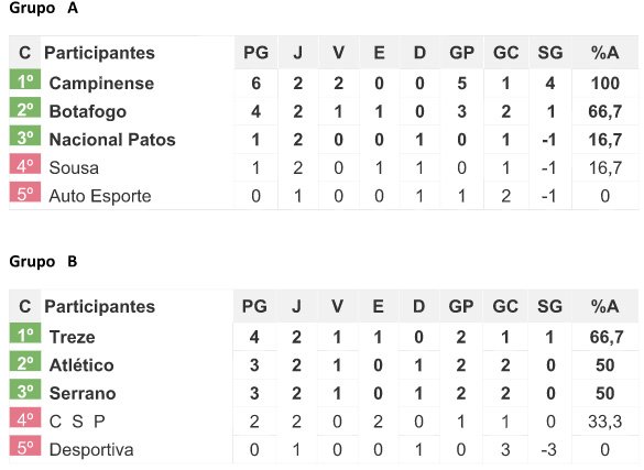 O Campinense é o único time com aproveitamento com 100% de aproveitamento com duas vitórias em duas rodadas. O time raposa soma seis pontos ganhos, liderando o Grupo A. O Botafogo é o segundo colocado. O Nacional de Patos é o terceiro. O Sousa é o quarto e o Auto Esporte o último colocado. O Treze com quatro pontos ganhos é o líder do Grupo B. O Atlético tem três pontos e Serrano soma três pontos. CSP tem três e Desportiva zero.
