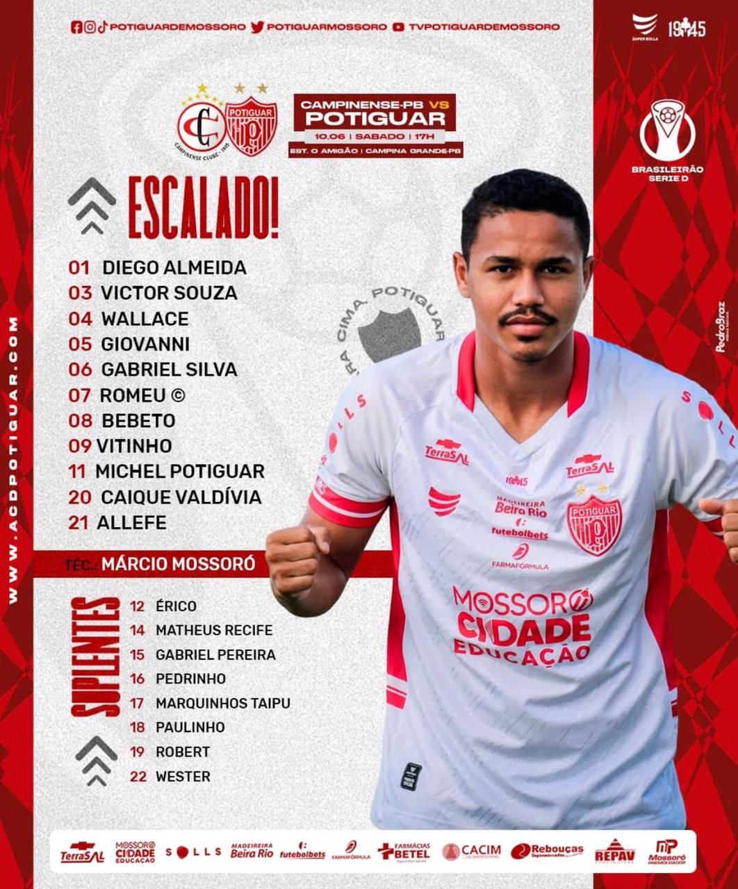Campinense 1×0 Potiguar-RN, Série D do Campeonato Brasileiro. A Raposa busca a reabilitação na competição neste sábado (10), às 17h, no estádio Amigão, em Campina Grande. O zagueiro Fredson abriu o placar aos 45 minutos do primeiro tempo, batendo de a perna esquerdo chute forte. Este foi o placar final. A Raposa entra no G4, chegando aos dez pontos.