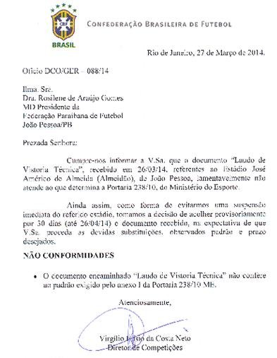“Estamos encaminhando o Ofício DCO/GER 088/14, que refere-se ao Laudo de Segurança do Estádio Almeidão, da cidade de João Pessoa”, afirma o documento assinado pelo dirigente da CBF.