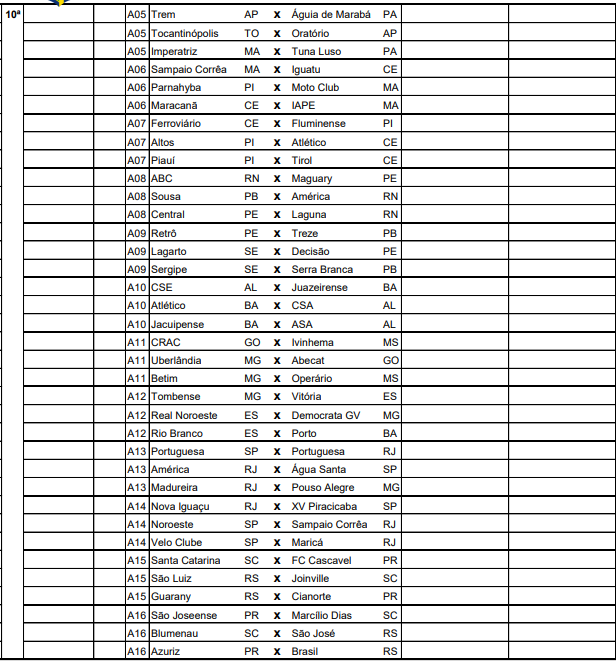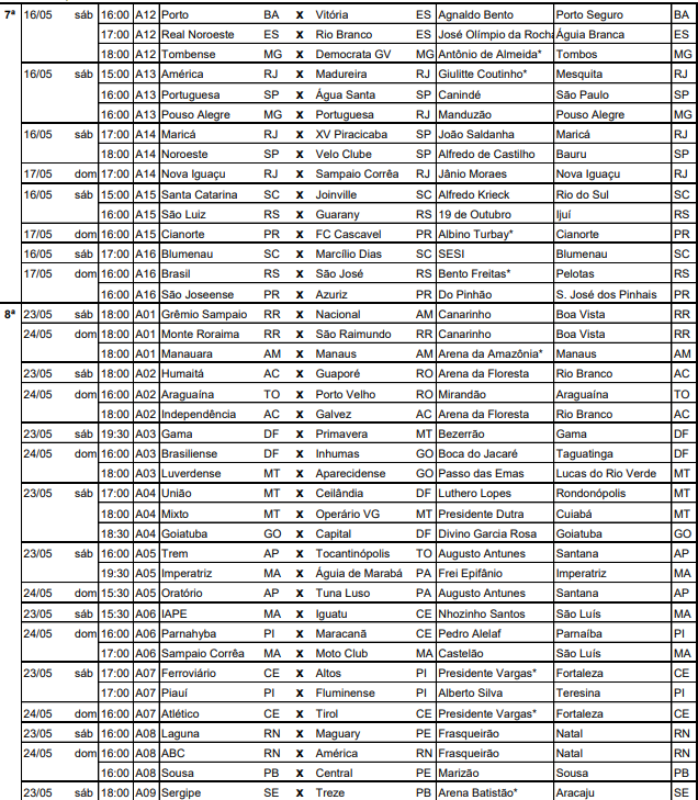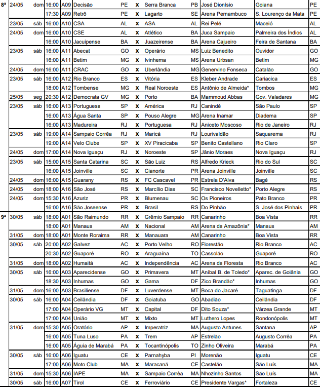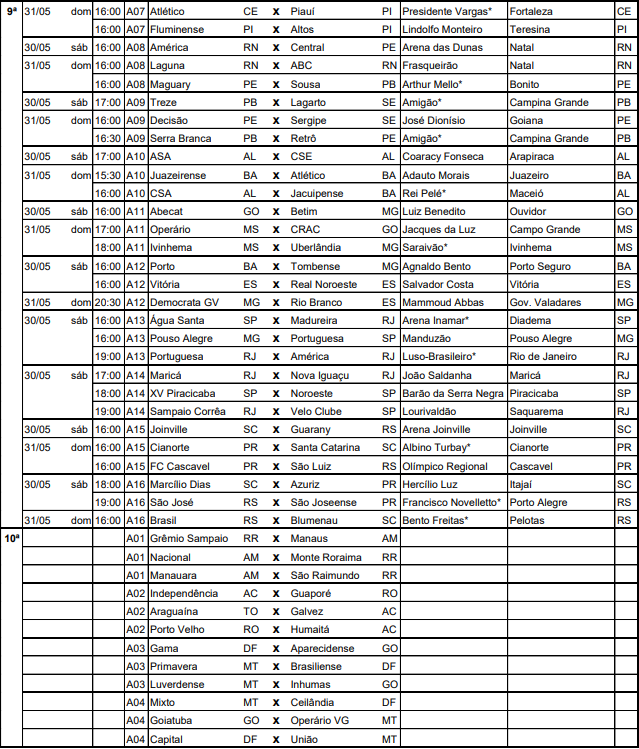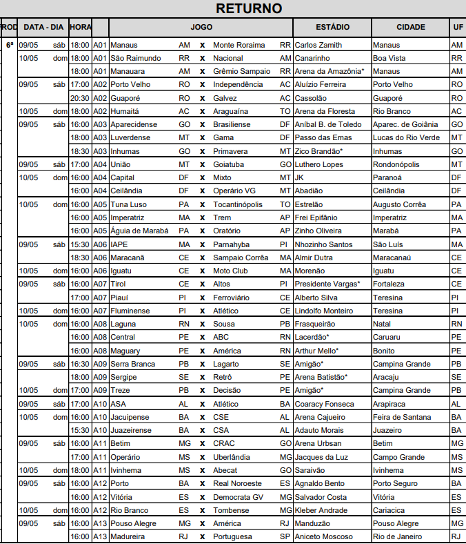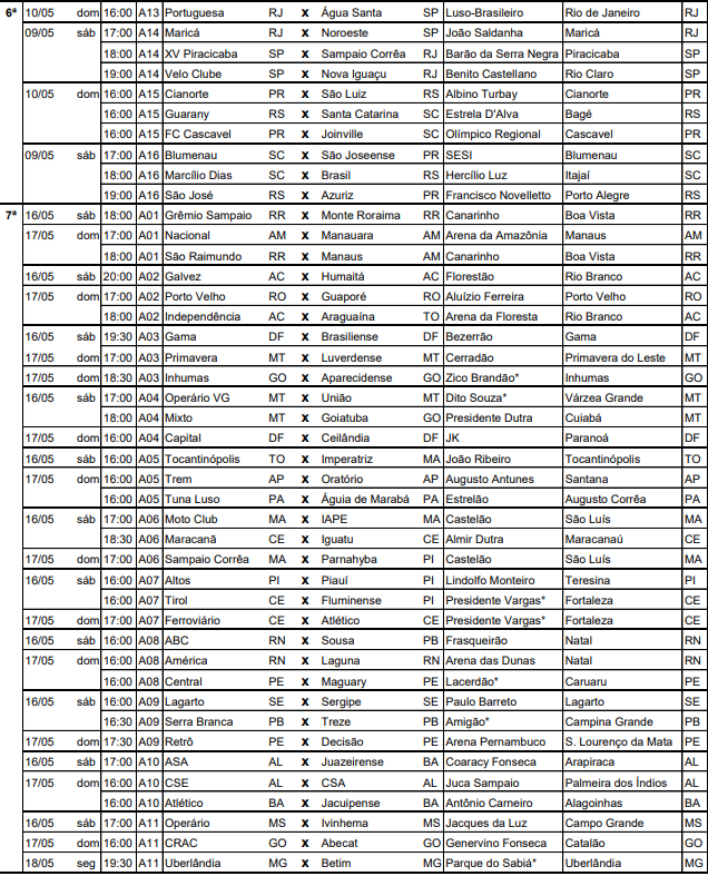 A CBF divulgou na tarde desta quarta-feira (22) a tabela detalhada da 6ª à 9ª rodada da primeira fase do Campeonato Brasileiro da Série D. O documento contém informações sobre datas, locais e horários das partidas