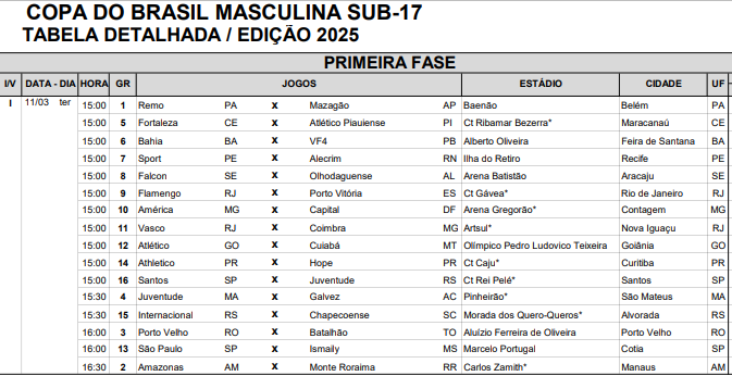 Vai começar a Copa do Brasil Sub-17. Na tarde desta sexta-feira (28), a Diretoria de Competições da CBF divulgou a tabela detalhada com os detalhes da primeira fase da competição. A Paraíba será representada pelo VF4.