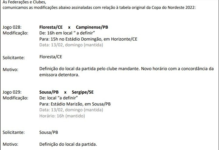 A CBF mudou horário de jogo do Campinense contra o Floresta, pela Copa do Nordeste. A entidade ainda confirmou que a partida do Sousa e Sergipe, será no estádio Marizão. Antes, a tabela com os jogos do Sousa constava a definir.
