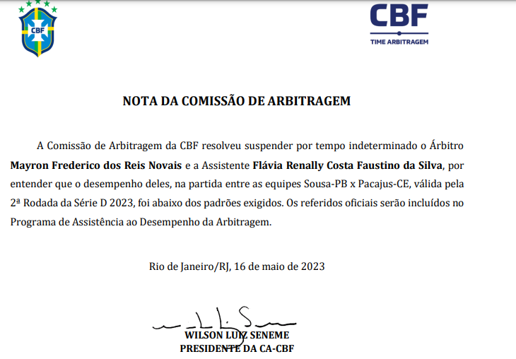 A Comissão de Arbitragem da CBF informa que o árbitro Mayron Frederico dos Reis Novais e a Assistente Flávia Renally Costa Faustino da Silva foram incluídos no Programa de Assistência ao Desempenho da Arbitragem (PADA). A decisão foi tomada após análise da atuação dos referidos oficiais na partida entre Sousa- PB e Pacajus- CE, válida pela 2ª rodada da série D 2023.