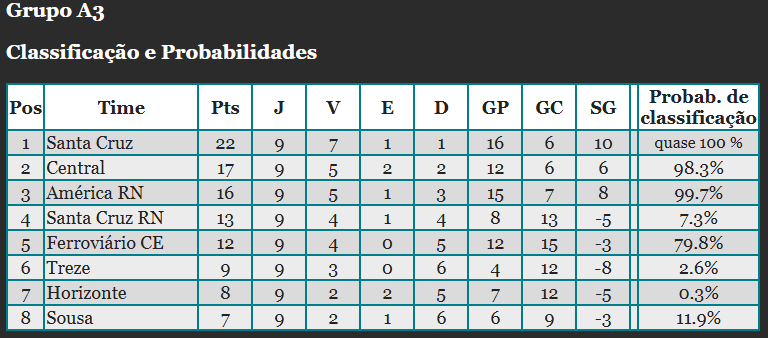 Mas o que deixa uma pergunta vagando é que, na rodada passada, o Treze atuou em casa, no estádio Amigão, e tinha 67,7% de chance de vencer o Santa Cruz-RN. Mas isso não aconteceu. Os potiguares tinham apenas 10,4% de chance e saírem de campo com os três pontos. As chances de empate eram de 21,8%.