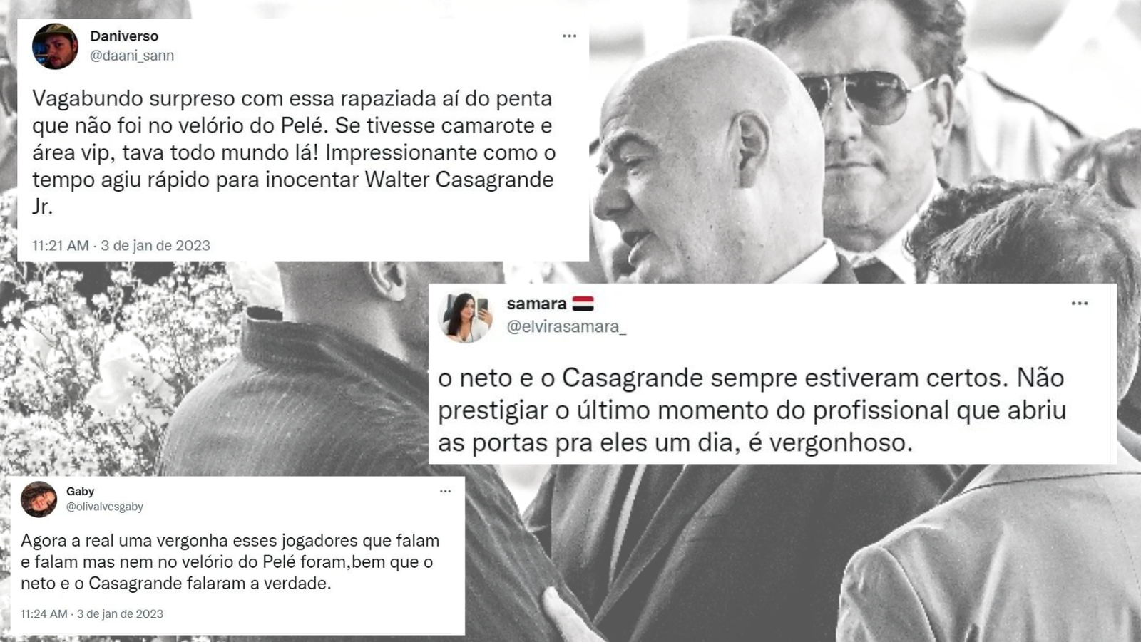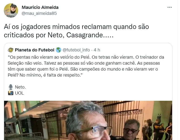 A ausência dos campeões mundiais mais recentes pela Seleção Brasileira no velório do Rei Pelé foi alvo de muito debate nas redes sociais. Diversos torcedores criticaram o fato de nomes badalados do futebol não se despedirem do maior ídolo do futebol nacional.