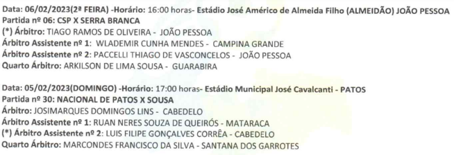 A arbitragem está definida para os dois jogos, entre os quais o clássico do Sertão, entre Nacional de Patos e Sousa, no estádio José Cavalcanti, em Patos.