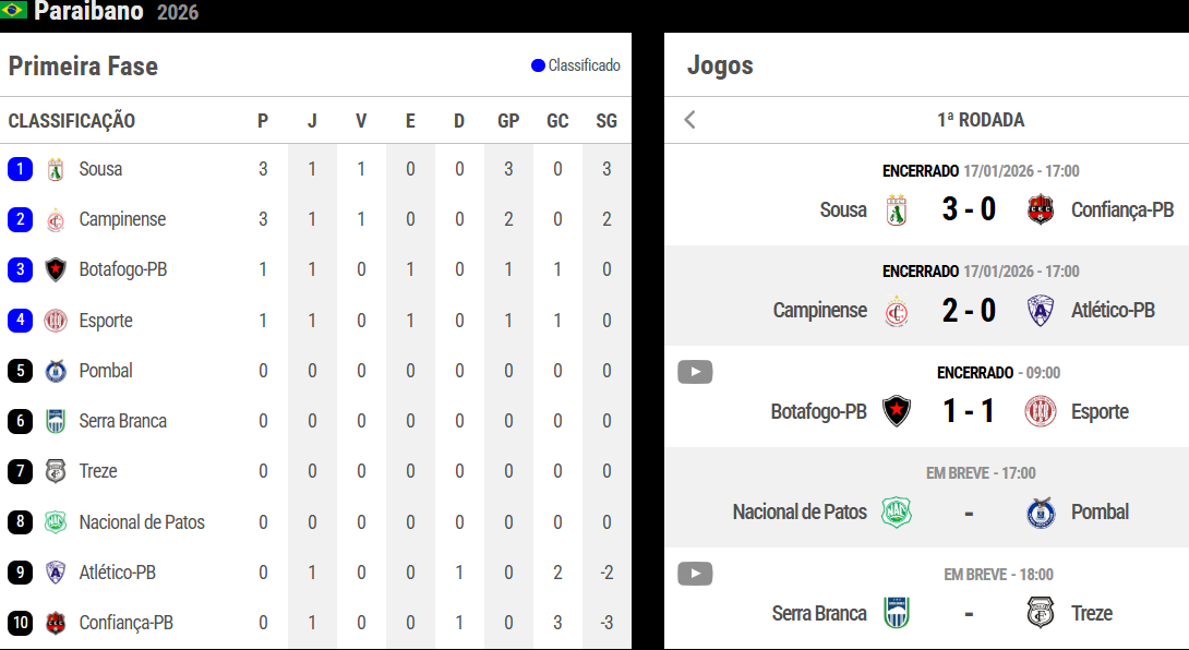 Os resultados da primeira rodada do Campeonato Paraibano da Primeira Divisão de 2026: Campinense 2 x 0 Atlético de Cajazeiras, Sousa 3 x 0 Confiança de Sapé, Botafogo-PB 1 x 1 Esporte de Patos; Nacional de Patos x Pombal, Serra Branca x Treze.