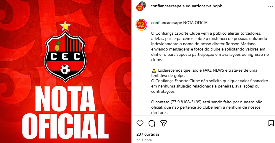 O Confiança Esporte Clube vem a público alertar torcedores, atletas, pais e parceiros sobre a existência de pessoas utilizando indevidamente o nome do nosso diretor Robson Mariano, enviando mensagens e fotos do clube e solicitando valores em dinheiro para suposta participação em avaliações ou ingresso no clube.