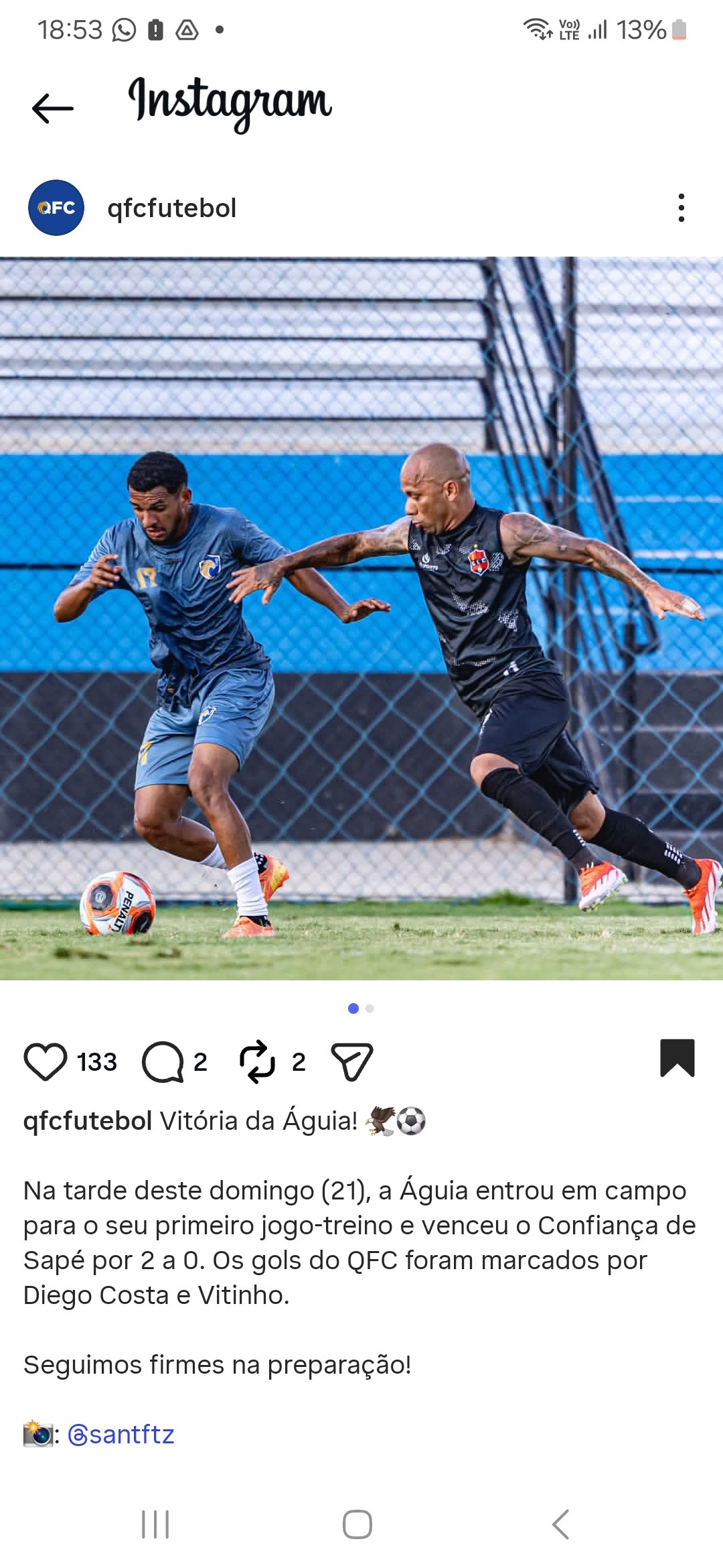 Com gols de Diego Costa e Vitinho, o QFC do Rio Grande do Norte venceu o Confiança de Sapé por 2 a 0, neste domingo, na cidade de Cearamirim-RN, em jogo amistoso.